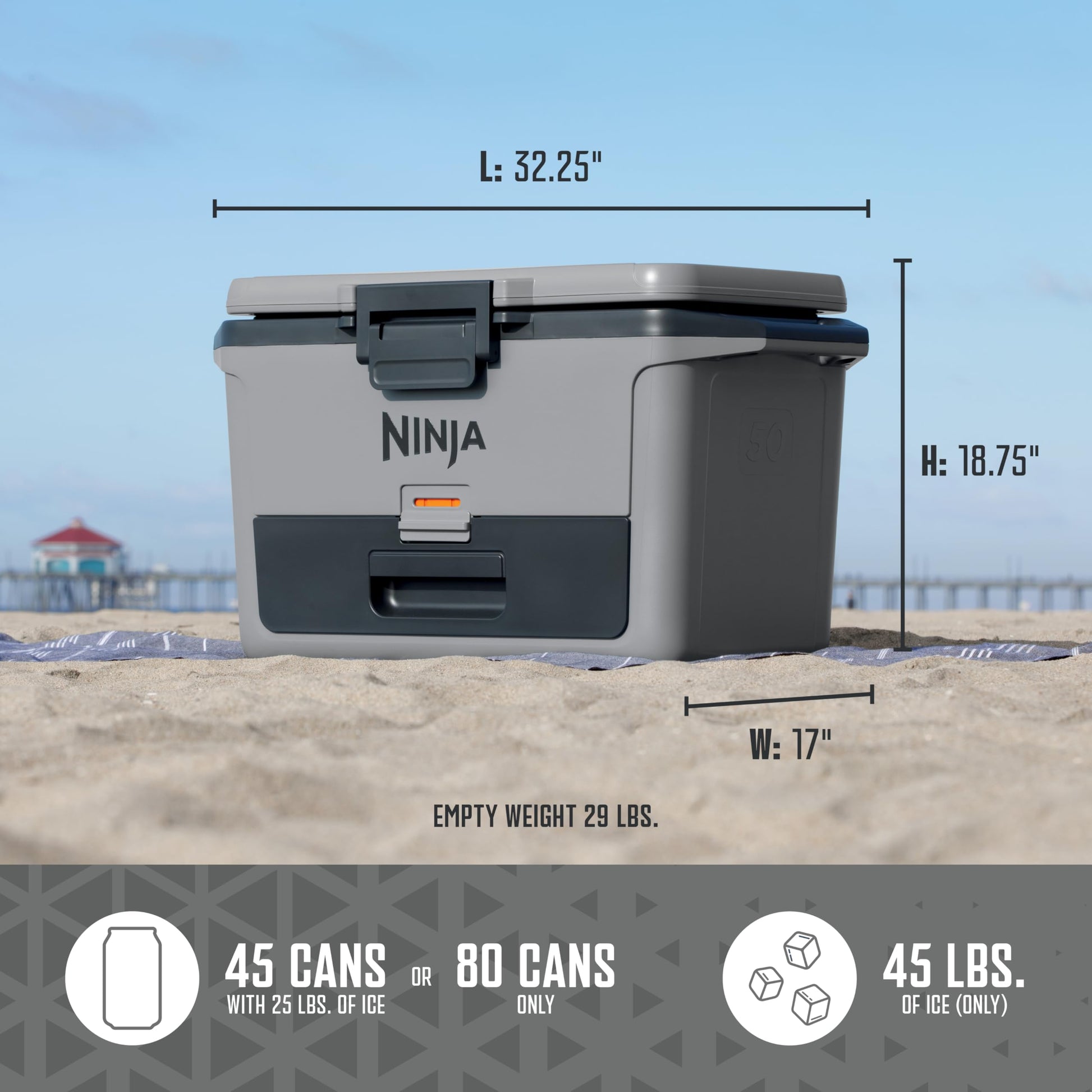 Details: Meet the Ninja FrostVault - the cooler with premium ice retention and fridge-temp dry storage. With FrostVault Technology, cold transfers into the Dry Zone to keep food cool, dry and separate at food-safe temperatures (under 40° F) for days. 50-quart capacity fits up to 80 cans or 50 bottles – plenty of room for all your favorite drinks. Streamline your outdoor adventures with heavy-duty construction and premium lid, latch and handles for easy access, storage, and transport.